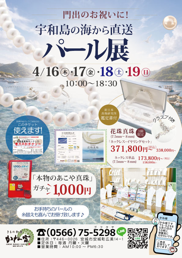 ご予約方法 お名前・お電話番号・ご希望時間をお伝えください。 4月開催!「パール展」 2026.03.05 イベント 新作ゆかた発表会 2026.03.05 イベント 2月・3月「ふりそで展」 2026.01.30 イベント